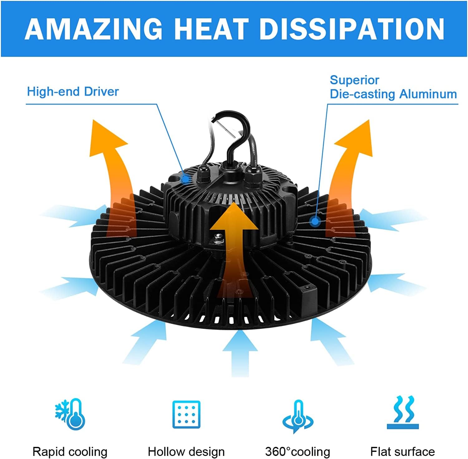 Constructed with industrial-grade die-cast aluminum, this LED high bay ensures excellent heat dissipation and component protection.