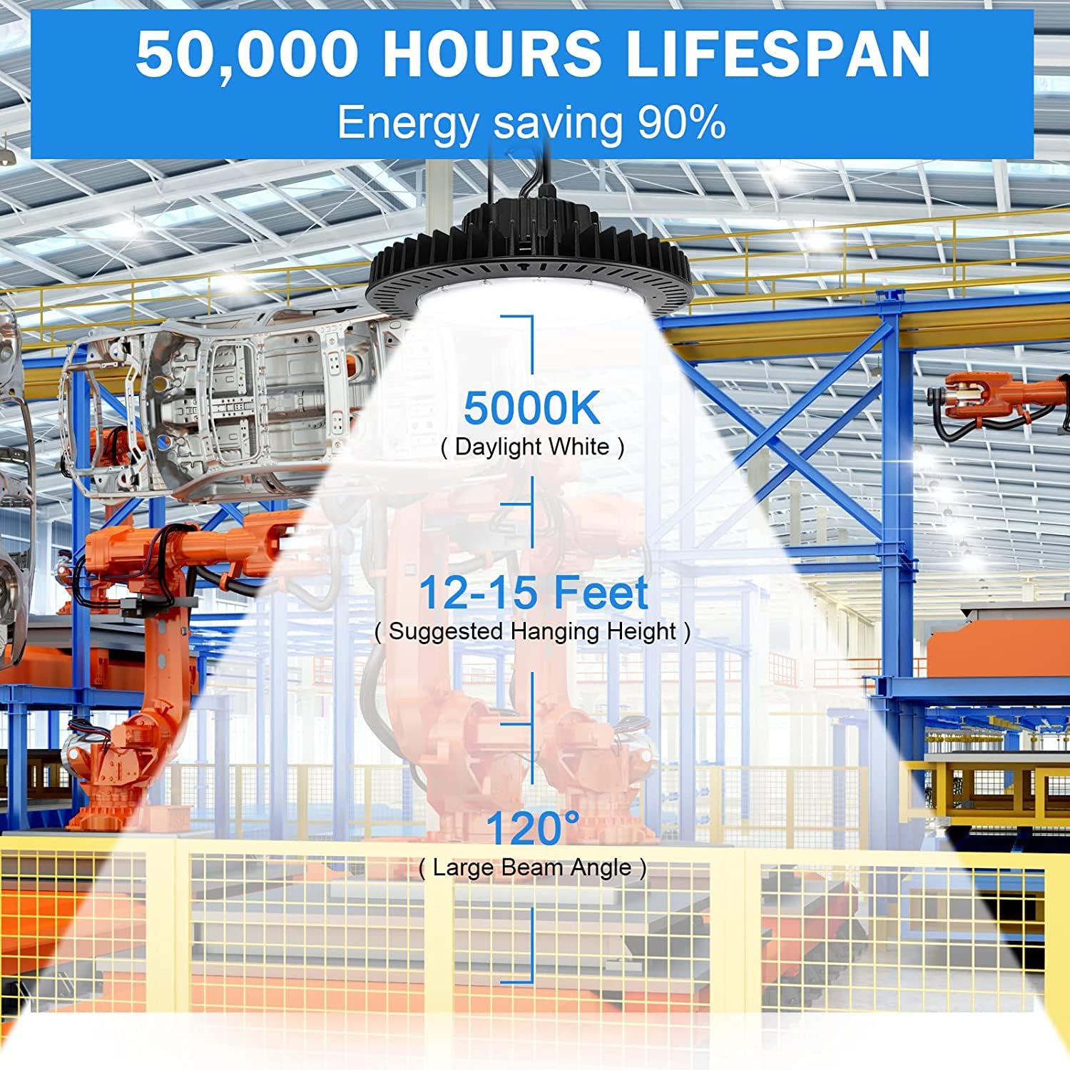 150W UFO LED High Bay Light delivers up to 21,750 lumens with 145 lumens per watt, replacing 600W metal halide lights and reducing electricity bills by up to 90%.