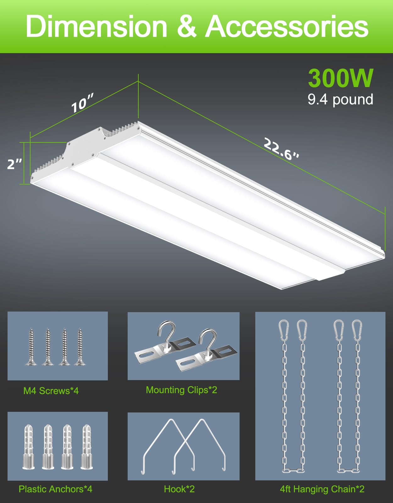 - 【Super Bright & Dimmable】Extra bright 300W high bay shop light with 45,000 lumen, 150LM/W high efficiency, high power factor >90%, saving 85% your electric bill, 277-480VAC input, 0-10V Dimmable