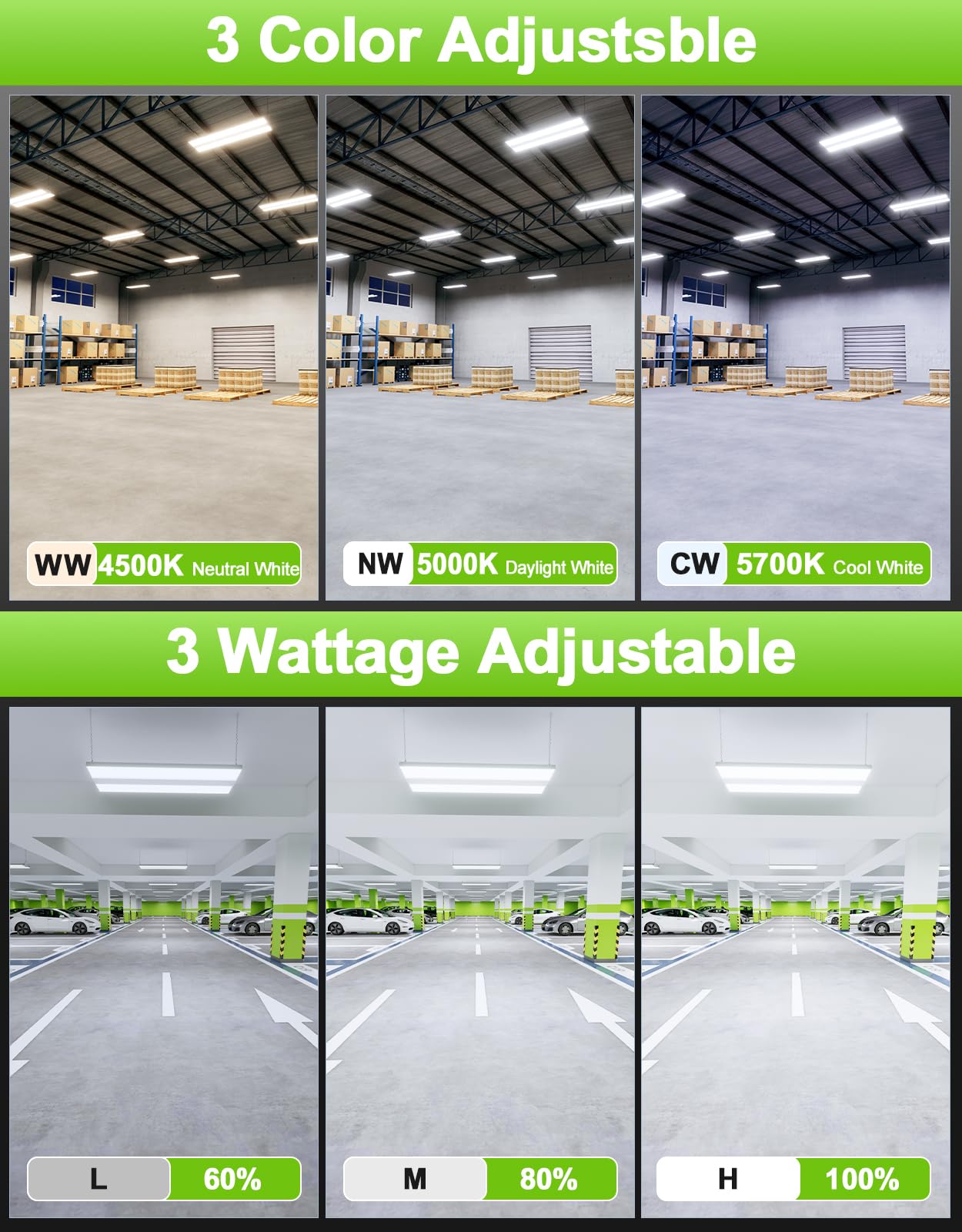 - 【3 POWER & 3 CCT Adjustable】 The liner high bay light can be adjusted color temperature from 4500k neutral white to 5000K daylight white, to 5700K cool white. And it also can be adjusted three wattage (L/M/H) options for 400W, 300W, 240W