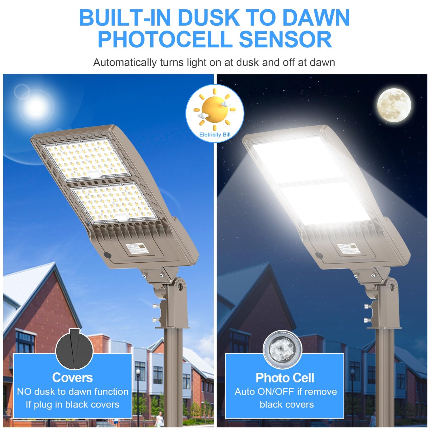 The dusk-to-dawn photocell automatically turns lights on at night and off during the day, saving energy and ensuring hassle-free operation — ideal for continuous outdoor use.
