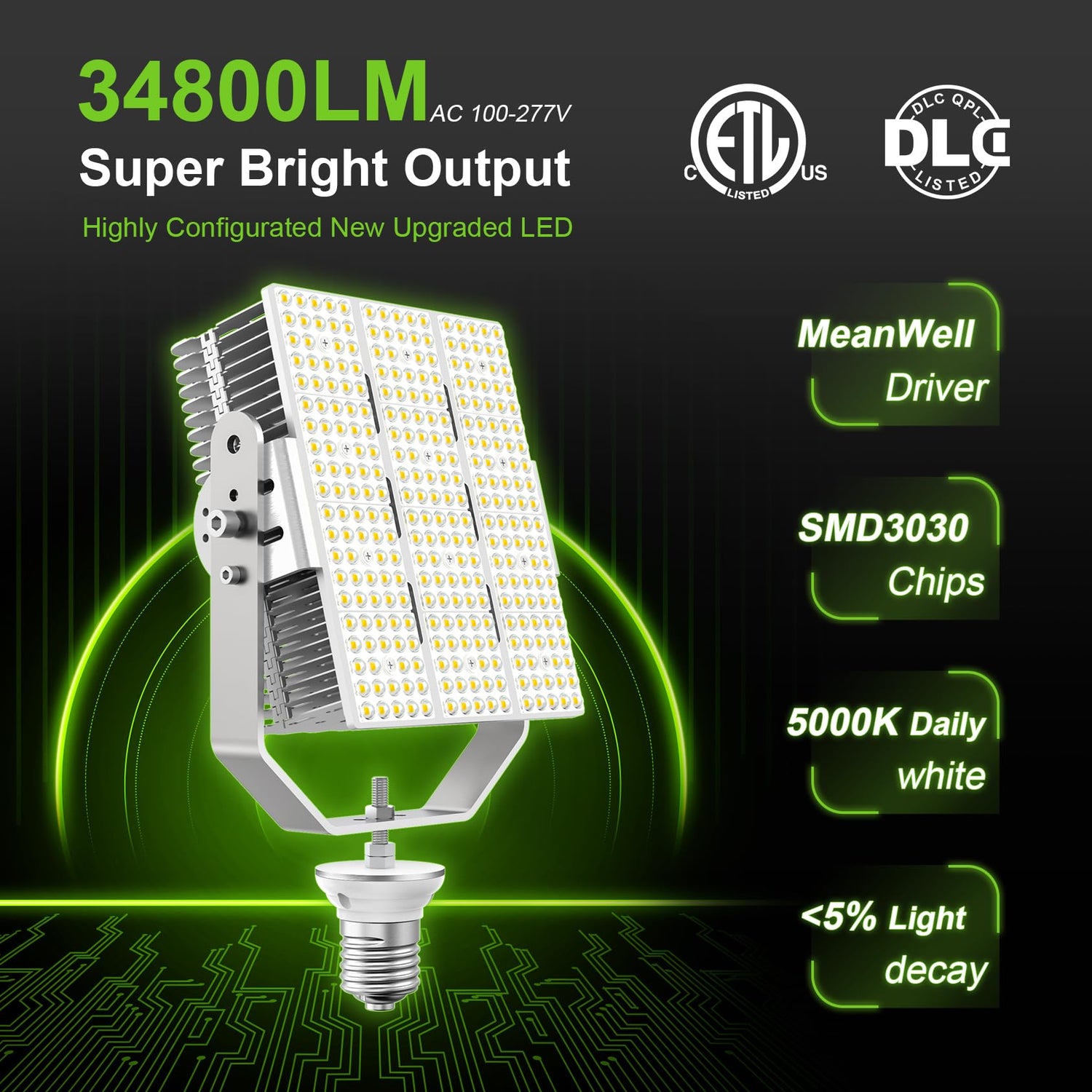 - Low Energy High Brightness: Outstanding 145 LM/W provides 34,800 lumen output. The LED module is a perfect replacement for 1000W traditional light, brighter and more than 90% energy saving.80+ CRI 5000K daylight for bright outdoor large area lighting